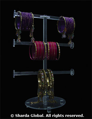 Clear acrylic three-tiered T-bar necklace and bracelet display made with endcaps on the bars to prevent jewelry from slipping off. |