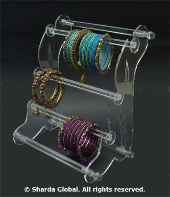 Three tiered floral imprinted jewelry display suitable for bracelets, bangles and watches. Each tier has a single display rod with endcaps to secure displayed ornaments. This simple dismantle-able stand fits décor needs of shops, boutiques and stalls. |