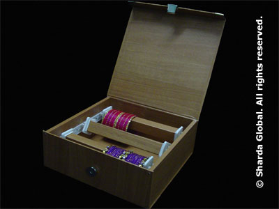 Teak wood finish jewelry storage box for brackets and bangles. This box comes specially equipped with locking system of 3 rolls to avoid mismanagement of handling precious jewelry |