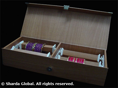 Teak wood finish jewelry storage box for brackets and bangles. This box comes specially equipped with locking system of 4 rolls to avoid mismanagement of handling precious jewelry |