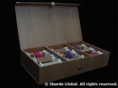 Teak wood finish jewelry storage box for brackets and bangles. This box comes specially equipped with locking system of 9 rolls to avoid mismanagement of handling precious jewelry |