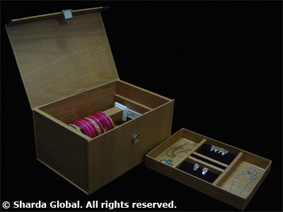 This rustic designer jewelry box accommodates 2 layers of valuable ornaments. The first layer is designed to hold earrings, nose rings and smaller fasion accessories. Also this box has 2 rolls with specially designed locking system |