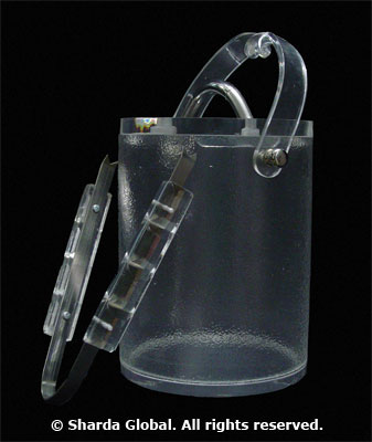 A contemporary ice pail that comes in a complete set with lid and tongs. The tongs are made of steel with a thick acrylic casing. |