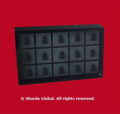 A stackable acrylic tray used to store and showcase sets of 15 finger ring/pendant collections. |